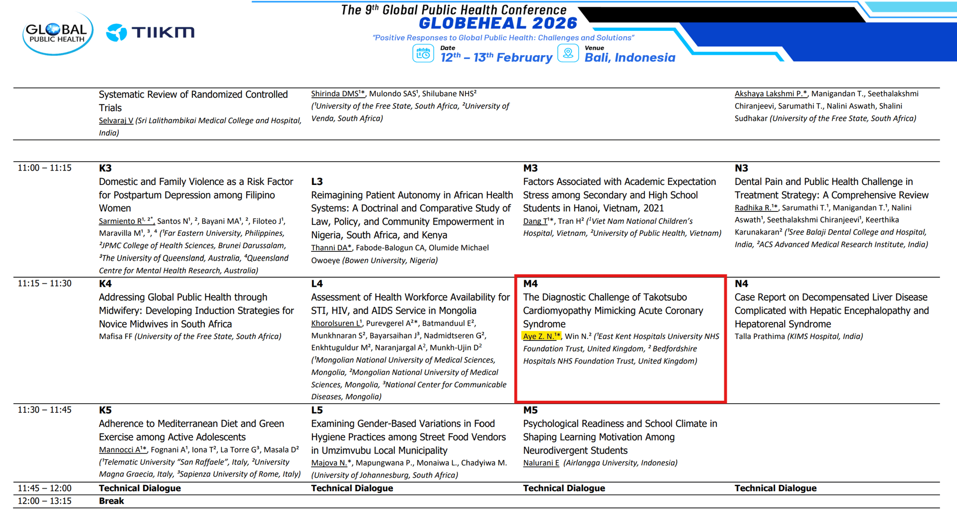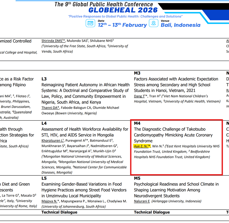 While GLOBEHEAL 2026 was soaking up the sun in Bali, I was soaking up the fluorescent lights of the hospital in the dull and chilly UK winter. Like many clinicians whose professional ambitions are currently outperforming their travel budgets, I joined virtually as an oral presenter. I was on the programme under the theme of mental Health and psycho-social wellbeing, speaking about a single 81‑year‑old woman whose chest pain journey encapsulated some of the biggest questions we face in modern medicine: ageing, complex comorbidities, psychosocial stress, and the limits of our diagnostic assumptions.