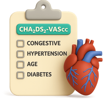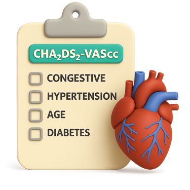 Estimates stroke risk in patients with atrial fibrillation based on age and comorbidities such as hypertension, diabetes, and vascular disease.
