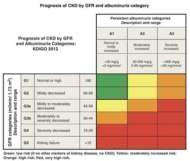 GFR Categories: G1 (>90) to G5 (<15).